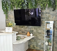 An untidy rear wall given a fresh green feel with matching on columns. Greenery has been custom installed around air-con ducts.