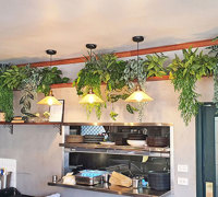 The servery in this chic restaurant has been given a green-lift with this 'curtain' of assorted trailing plants. A cost-effective infusion of greenery with no lost floor space...