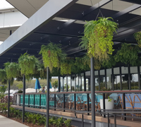 Timber ceiling backdrop really highlights lush green hanging-baskets in Surf Club