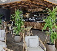 Bright strappy leaves & bare stems enhance cane & timber in beachfront bar...